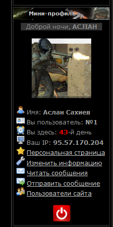<center> <?if($USER_AVATAR_URL$)?><img alt="Аватарка" class="userAvatar" title="$USERNAME$" src="$USER_AVATAR_URL$" border="0"><?else?><?if($USER_LOGGED_IN$)?><img alt="Нет аватара" class="userAvatar" title="Аватар не установлен" src="http://all-for-cs.clan.su/Forum/no_avatar.png" border="0"><?else?><img alt="Гость" class="userAvatar" title="$USERNAME$" src="http://all-for-cs.clan.su/mini-profil/vxod_ava.gif" border="0"><?endif?><?endif?></center> <br> <?if($USER_LOGGED_IN$)?> <div align="left"><img src="http://all-for-cs.clan.su/mini-profil/user.png" border="0" alt="•"> Имя: <b>$USER_FULL_NAME$</b><br> <img src="http://all-for-cs.clan.su/mini-profil/vcard.png" border="0" alt="•"> Вы пользователь: <b>№$USER_ID$</b><br> <img src="http://all-for-cs.clan.su/mini-profil/clock.png" border="0" alt="•"> Вы здесь: <span style="color: #ff0000"><b>$USER_REG_DAYS$</b></span>-й день<br> <img src="http://all-for-cs.clan.su/mini-profil/monitor.png" border="0" alt="•"> Ваш IP: <b>$IP_ADDRESS$</b><br> <img src="http://all-for-cs.clan.su/mini-profil/star.png" border="0" alt="→"> <a title="Ваш профиль" href="$PERSONAL_PAGE_LINK$">Персональная страница</a><br> <img src="http://all-for-cs.clan.su/mini-profil/wrench.png" border="0" alt="→"> <a title="Изменение личной информации" href="javascript:openOnClick('options')">Изменить информацию</a><br> <?if($UNREAD_PM$ || $IS_NEW_PM$)?><img src="http://all-for-cs.clan.su/mini-profil/email_open.png" border="0" alt="→"> <script type="text/javascript">function flashit(id,cl){var c=document.getElementById(id);if (c.style.color=='red'){c.style.color=cl;}else {c.style.color='red';}}setInterval("flashit('upml2','')",500)</script><?else?><img src="http://all-for-cs.clan.su/mini-profil/email.png" border="0" alt="→"><?endif?> <a id="upml2" href="javascript:openOnClick('mail')" title="Личные сообщения (ЛС)">Читать сообщения<?if($UNREAD_PM$)?> (<B>$UNREAD_PM$</B>)<?endif?></a><br> <img src="http://all-for-cs.clan.su/mini-profil/email_go.png" border="0" alt="→"> <a title="Отправить ЛС" href="javascript:openOnClick('send')">Отправить сообщение</a><br> <img src="http://all-for-cs.clan.su/mini-profil/group_edit.png" border="0" alt="→"> <a title="Список пользователей" href="javascript:openOnClick('users')">Пользователи сайта</a> </div> <div align="center" id="anyclass"><br><a href="javascript://" title="Покинуть сайт" onclick="if (confirm('Вы действительно хотите выйти?')) {alert('Счастливого пути Вам.');location.href='$LOGOUT_LINK$';} else {alert('Спасибо, что остались с нами!')};"><img alt="Выход" src="http://all-for-cs.clan.su/mini-profil/exit.png" border="0" alt="→"></a></div>